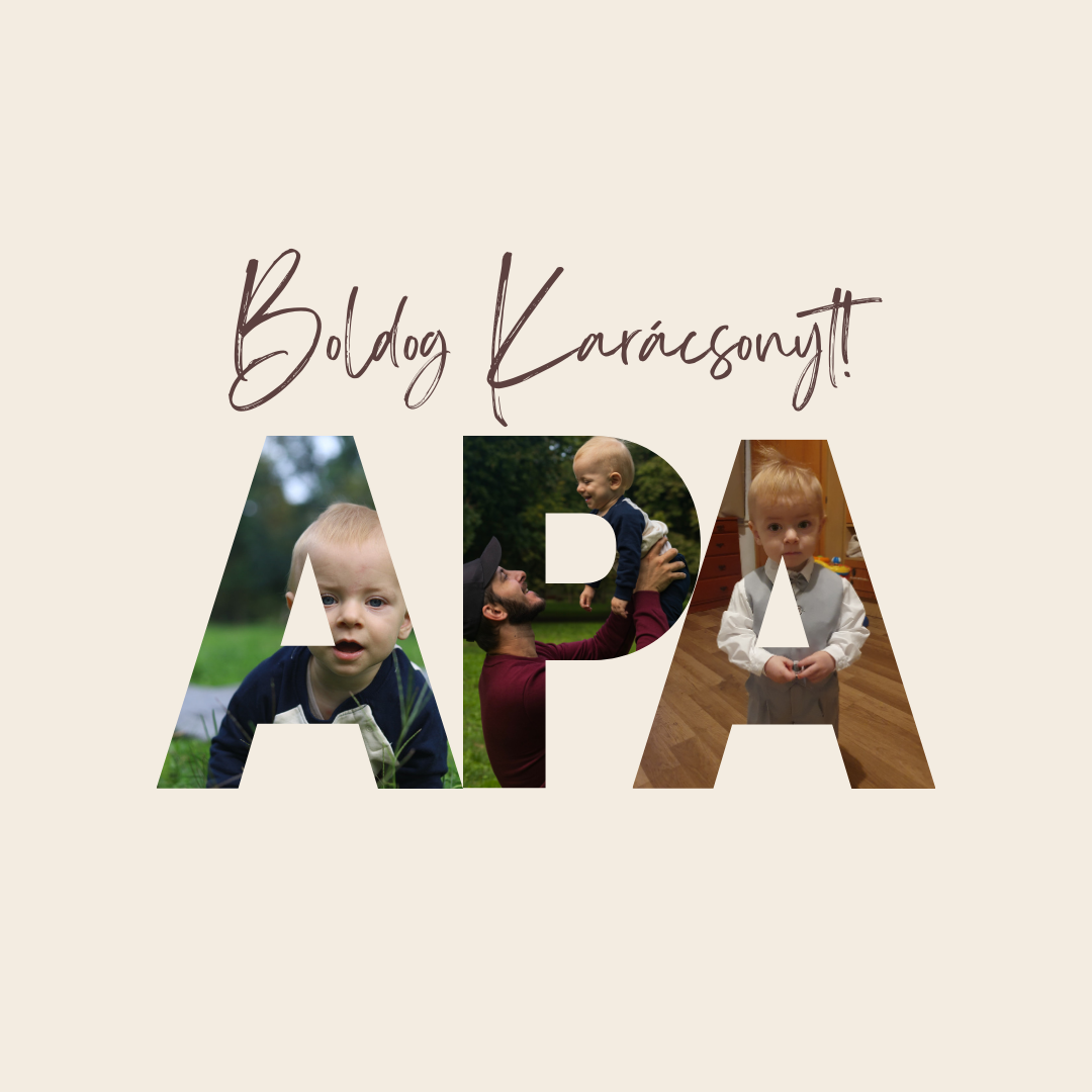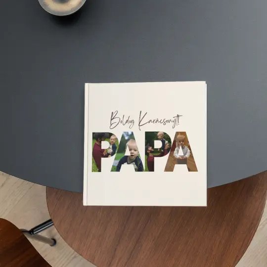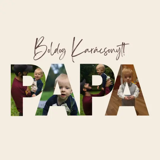 Ez a prémium fotókollázs „PAPA” felirattal és a betűkbe komponált fotókkal egyedi módon mutatja meg a család legszebb pillanatait. A finom, letisztult dizájn és a „Boldog Karácsonyt!” kézírásos felirat meleg ünnepi hangulatot áraszt.