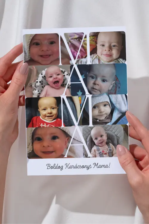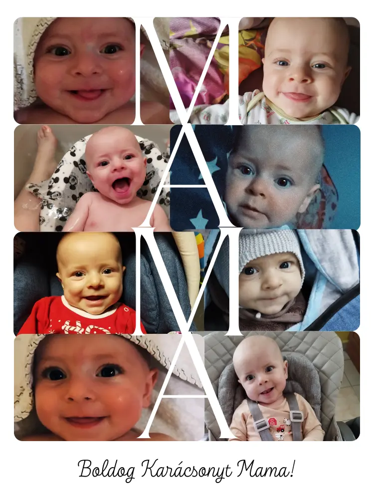Ez a prémium fotókollázs egyedi felirattal és a betűk köré komponált fotókkal egyedi módon mutatja meg a család legszebb pillanatait. A finom, letisztult dizájn és a „Boldog Karácsonyt!” kézírásos felirat meleg ünnepi hangulatot áraszt.